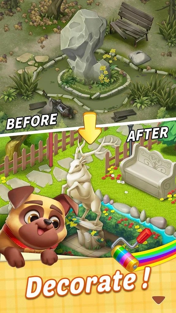 故事主角简继承了一栋老旧庄园,她的梦想是成为著名设计师并获得金奖。玩家需要通过完成三消关卡来收集装修材料,逐步翻新客厅、厨房、花园、狗窝等区域。随着剧情推进,你会遇到热心的家庭医生、温柔的兽医和冷酷的律师等角色,还能解锁简的浪漫爱情故事。游戏包含海量关卡和任务,每完成一个区域都能获得成就感,最终目标是打造出镇上最漂亮的豪宅。
