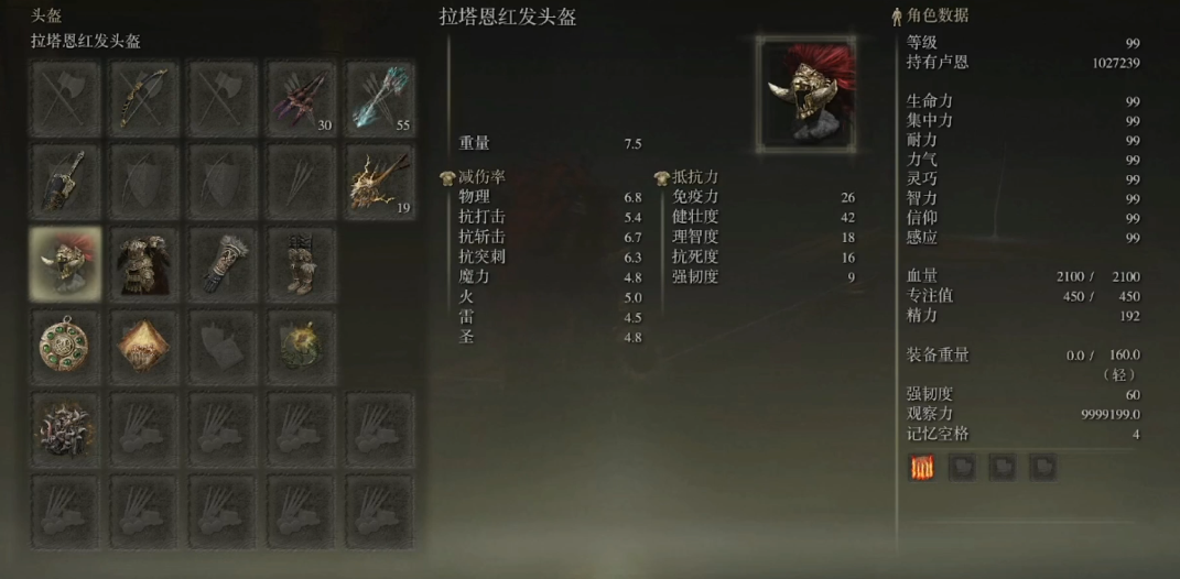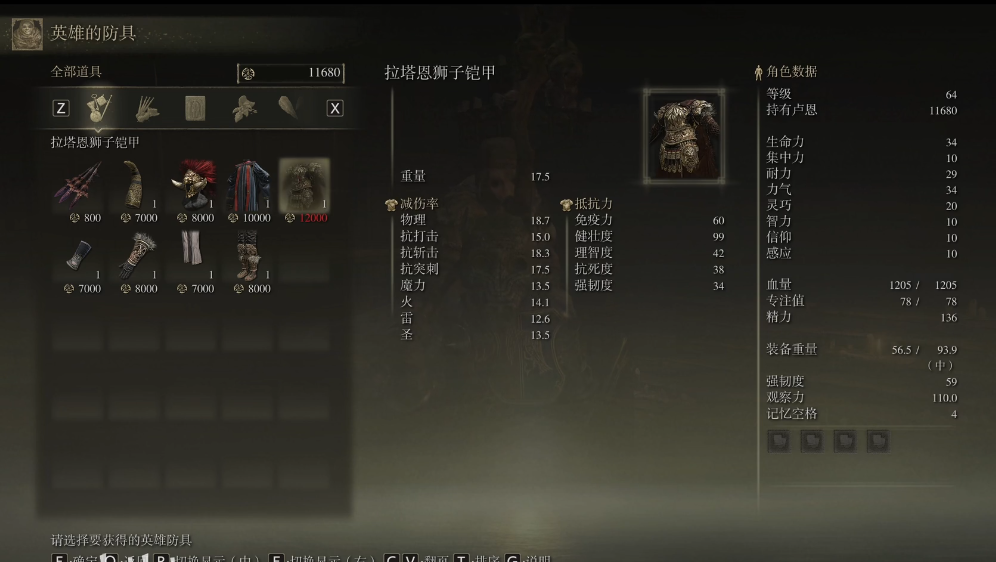 红发将军套装的属性分布较为均衡,尤其在抗性和防御性能上表现优异。头盔的描述中拉塔恩将红发视为英雄的象征,而套装的其他部分也延续了这一主题,例如铠甲上的黄金狮子纹饰,呼应了拉塔恩对初始之王葛孚雷的崇拜。装备的整体重量属于中上水平,适合搭配中量级武器使用,若玩家偏好灵活战斗风格,可能需要通过护符或加点调整负重。