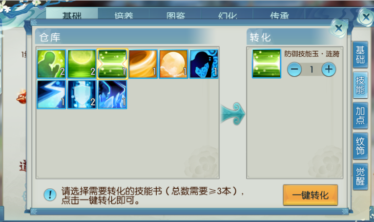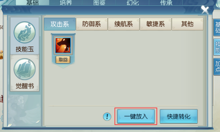 取出包裹里的技能书也很简单,直接点击物品下方的取回按钮就行。如果包裹太满,还能使用快捷转化功能,把三个不需要的技能玉合成一个新技能玉,规则和八卦炉合成一样。记得经常清理不需要的技能玉,给包裹腾出空间存放更高级的技能书。