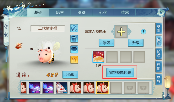 咱们打开游戏界面后,直接点击右下角的宠物图标就能进入宠物系统啦。在宠物界面的左侧菜单栏里,找到基础选项卡,往下滑动就能看到技能按钮,点进去就是宠物技能包裹的入口了。这个包裹专门用来存放宠物技能玉和觉醒书,技能玉可以自由交易,但觉醒书是绑定的不能交易哦。