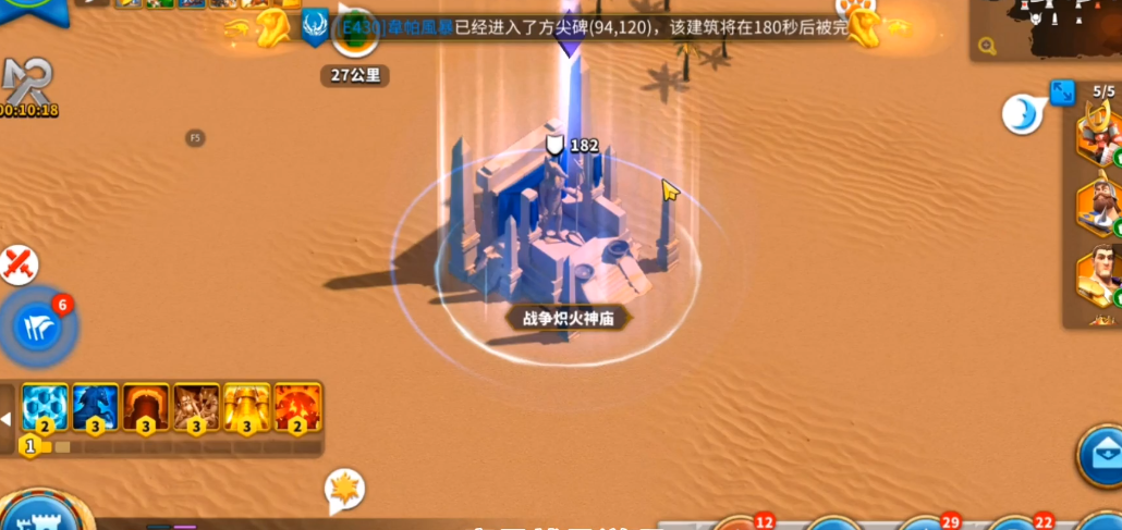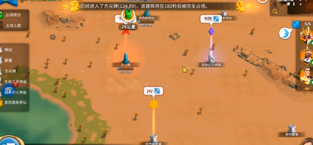 第一阶段优先占领方尖碑和哨站,建议派遣曹操、源义经等骑兵统帅带一级骑兵快速抢占己方建筑,同时集结敌方方尖碑以打乱对手节奏。第二阶段开放其他建筑后,集结手需快速攻占敌方要塞或神庙,并派遣驻防武将巩固占领。第三阶段奥西里斯之柩刷新后,中路需集中兵力争夺,上下路同步支援。棺材运送成功可获得3000-3500分,但过程中易受干扰,需骑兵加速运输并分兵防守。