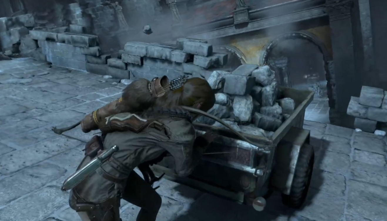 继续前进会遇到一个大厅,内有背对的敌人,可利用烟雾弹暗杀。右拐角有四名敌人聚集,建议提前制造烟雾弹创造有利条件。随后需解决分左右两路的机关才能打开大门。左侧路线需沿绳索滑至卡车,爬上石桥后操作绞盘和手推车,使卡车坠落并拉断绳索。右侧路线则需利用环境互动,例如铁桶装水破坏起重机结构。注意沿途可能出现增援敌人,尤其是重甲兵,建议使用汽油弹或破片手榴弹应对。