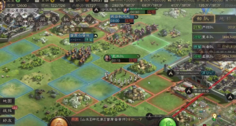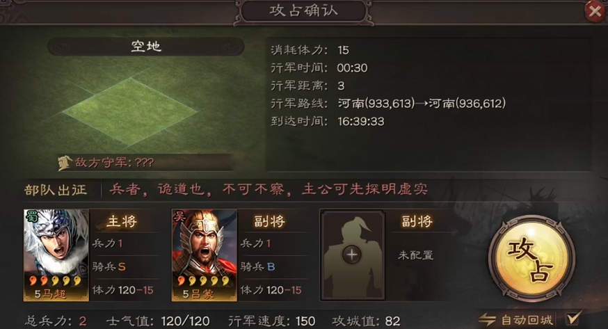 占领空地是前期扩张势力范围的基础操作。空地虽然不产出资源,但作为连接资源地的桥梁至关重要。占领空地需要满足两个条件:一是部队必须与已占领的领地相邻,二是击败守军后需停留至战令CD结束。侦查功能可提前查看守军兵种及武将信息,建议优先选择兵种被克制的目标以减少战损。