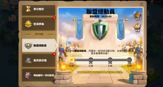 资源采集和联盟合作是10级后的关键玩法。加入活跃联盟能获得加速建造、科研支持以及联盟宝箱奖励。联盟领土内的资源点采集速度提升25%,同时需参与联盟活动如攻城掠地和圣所争夺。野蛮人城寨和守护者是获取经验书与符文的重要途径,建议优先使用打野天赋统帅如洛哈或布迪卡,以节省行动力并提高效率。