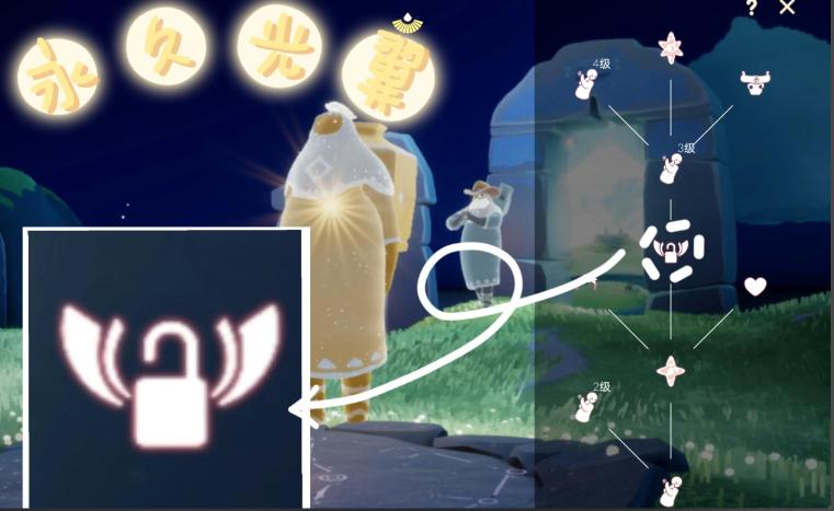进入暴风眼后,将收集的光之翼献给石像,每献祭四个可获得一根升华蜡烛。重生后,在星盘上解锁先祖的永久光之翼节点,这些翅膀不会因死亡而丢失。随着解锁的永久光之翼增多,重生后自带的光翼数量也会提升,减少重复跑图的压力。