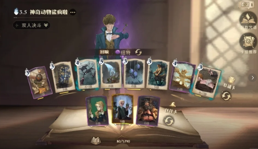 纽特·斯卡曼德回响的核心机制在于每使用三张召唤卡后,可随机获得一张消耗1点魔力的特殊生物卡(毒角兽、蜷翼魔或特波疣猪)。这一特性决定了卡组需围绕低费召唤物展开铺场,通过持续施压消耗对手解场资源。基础搭配通常包含嗅嗅、鸟蛇、马人、灵猫等低费驻场卡,辅以清水如泉等解场法术。纽特卡组的优势在于操作门槛低且成型快,适合新手或偏好召唤流的玩家。