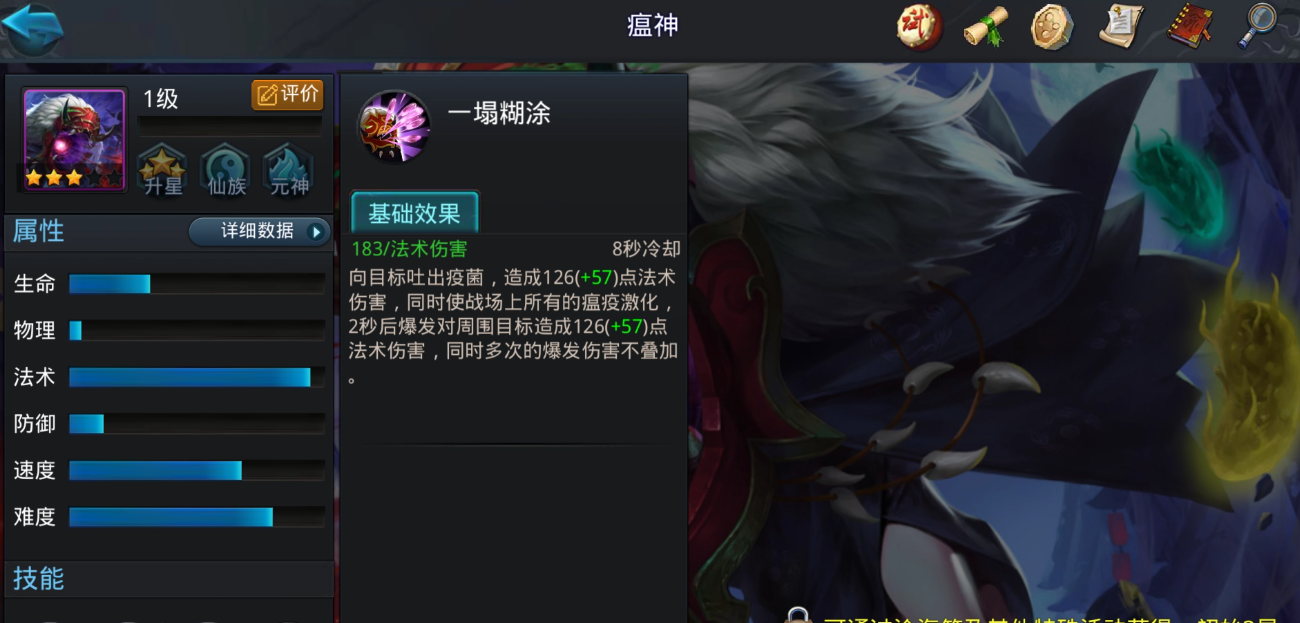 瘟神的主动技能一塌糊涂可对目标造成法术伤害并激化战场瘟疫,2秒后爆发范围伤害,而一场空梦则施加春瘟状态,双方在3秒内持续受到生命影响。被动技能一泻千里在血量变化时随机释放瘟疫,包括春瘟、夏瘟、秋瘟、冬瘟四种效果,分别对应不同的减益与控制。元神技能召唤瘟神时,其释放的技能伤害与治疗效果仅与元神属性相关,与英雄自身面板无关,因此需优先强化元神境界与魂印镶嵌以提升效果。