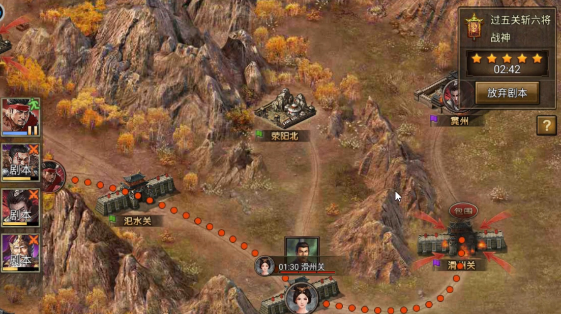 汜水关、荥阳关、荥阳北需同步推进,这是剧本最难的部分。汜水关先派1将刷1影,其余两将跟进;突进荥阳关时影子数量需达到NPC两倍,再分兵突进荥阳北。荥阳北建议使用典韦或非战法装许褚,单挑后立即处理汜水关事件。若武将较弱,可派双将处理事件以提高成功率。滑州关突进后刷2影,单挑至冀州前保留至少3名空闲武将,用于后续事件链的衔接。