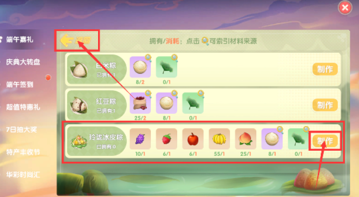 水果类材料比如苹果、草莓、香蕉等是制作玲珑冰皮粽的关键,这些需要在自己的家园种植,或者去好友家帮忙采集。每种水果成熟时间不同,提前规划好种植顺序很重要。荷叶和粽叶看起来很像,但粽叶需要点击活动界面里的放大镜图标,按照指引去指定地点采摘,别搞混了哦。