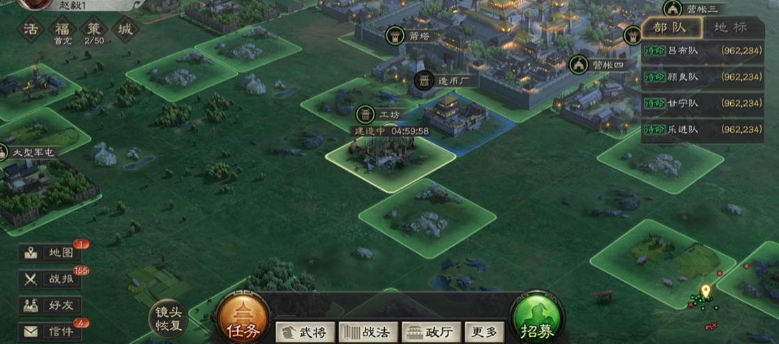 工坊的产量加成非常可观,1级时每小时就能提供700点四项资源,每升一级还能多700产量。虽然最高能升到5级,但建议升到3级就够用,这时候每小时2100的资源相当于近7块5级地的总产量。记住工坊土地上不能屯田,所以选址时要考虑清楚。