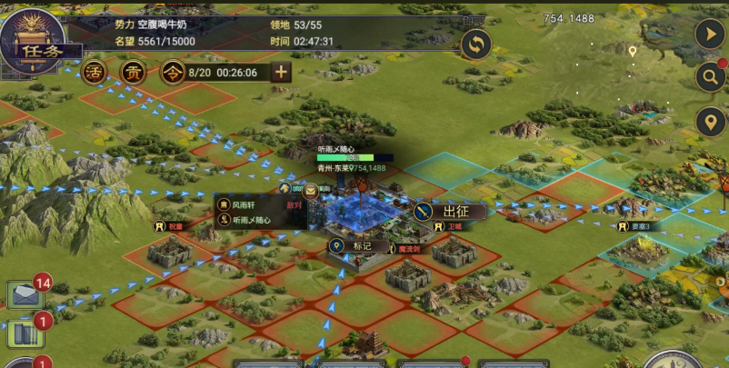 急行军的具体操作分为两个阶段:首先需由同盟指挥官(盟主、副盟主或指挥官)在军略界面选择急行军战术,并在地图上划定作用范围(最大覆盖11×11格区域)。生效后,同盟成员向该区域内的任何目标调动部队时,系统会自动计算加速效果。需注意深夜休战期间(23:00-次日8:00)无法启用该功能,且每个同盟同时最多维持3个军略效果。