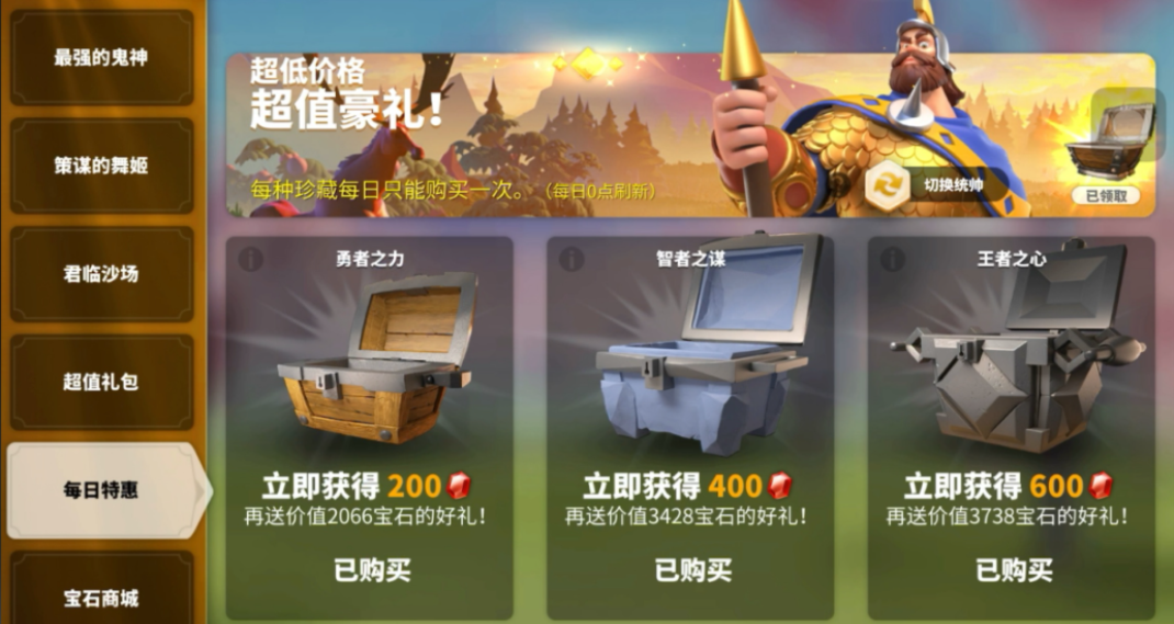 每日特惠礼包是稳定获取金钥匙的付费渠道,购买后除基础资源外必得随机传说统帅碎片。该礼包采用保底机制,每开启三个必出一个橙色雕像,建议玩家合理规划开启节奏以提高资源利用率。VIP等级提升会解锁额外宝箱购买次数,VIP12每日可领取两个金色雕像,长期积累对英雄觉醒至关重要。