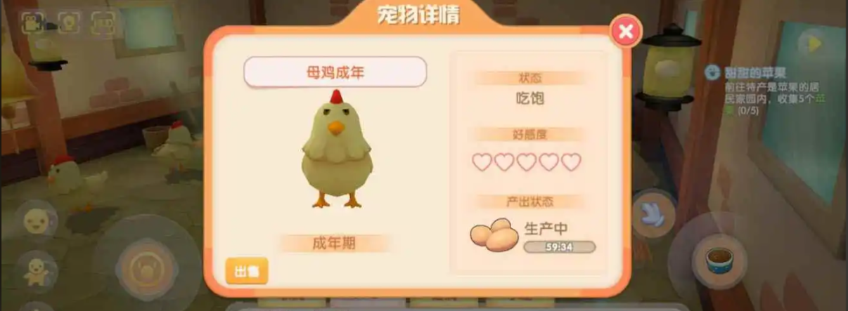 帮别人喂鸡的时候还要注意时间安排,白天可以让小鸡们在外面自由活动,它们会自己找吃的,这样可以省下不少饲料。但是到了晚上或者下雨天,一定要记得把小鸡们叫回屋里,不然它们会害怕的。摇动禽舍外的铃铛就能让小鸡出去玩耍,摇动屋内的铃铛又能让它们回家,这个操作可以反复进行,对增加小鸡的好感度很有帮助。