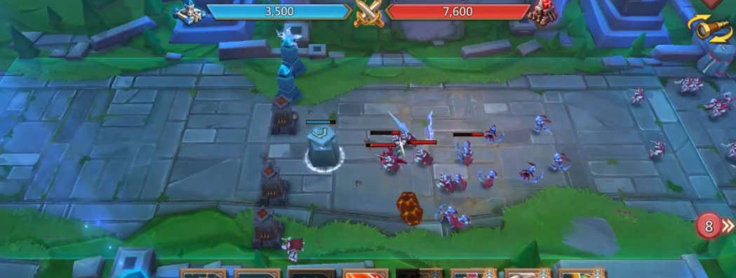面对海量小兵时,避免贸然推进,应选择在后场埋设魔像和攻击型防御塔进行防守反击。优先用技能消灭敌方炮车单位以降低防御塔压力,待兵线清理完毕后再逐步推进。火球或黑炎技能能高效处理密集小兵群,但需注意保留至少一次使用次数应对后期敌方英雄突袭。