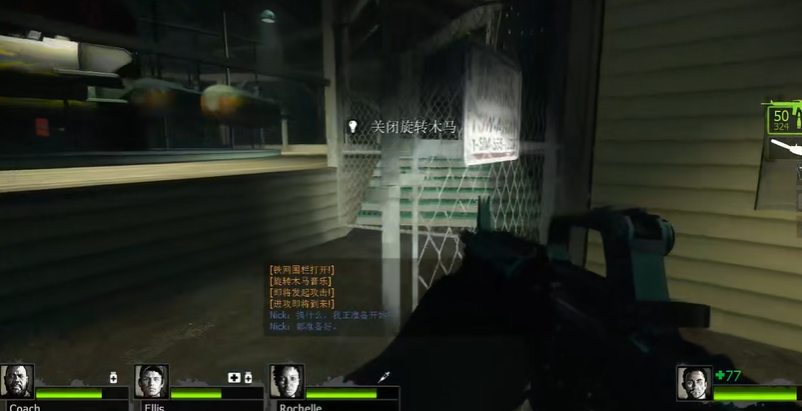 从关卡起点出发后,玩家需沿游乐场左侧路径前进,途中会经过糖果屋、水上乐园等区域。这些区域虽存在少量僵尸,但主要难点在于后续的旋转木马环节。抵达木马场地前需通过一段屋顶路线,此处可补充弹药和医疗物资,建议提前分配资源。进入木马区域后,中央控制台是触发开关的位置,四人同时互动后音乐响起,应立即向左侧门移动。