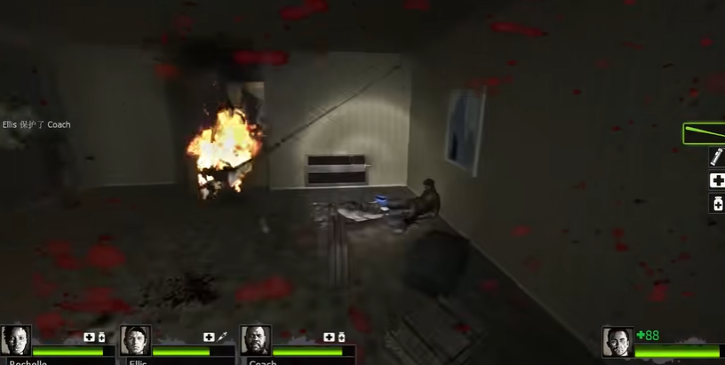 到达底层后,走廊尽头会出现冒着白烟的危险门,切勿开启以免触发火焰喷射。沿主走廊直行至末端房间,清除内部感染者即可进入电梯。电梯下降过程中会因故障停运,需按E键手动开门进入着火区域。场景混乱且地面火焰会造成持续伤害,需快速观察安全路径,优先消灭阻挡前进的感染者,避免在火场中停留过久。