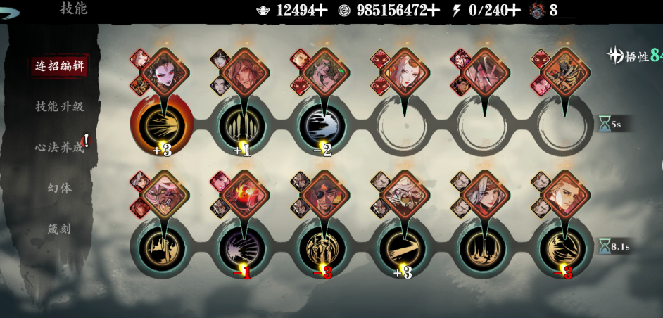 心法方面魔堡故人和有悔羁绊都要5紫火,这是基础要求。光与暗羁绊也很重要但要求相对宽松。白衣留情铸魂后的长青效果即使放在副卡槽也能生效,建议放在固影或之前的位置。万魔能提供55%爆伤和55%攻防加成,不建议替换。一剑基础技能可以关联蛇眼心法提供中毒效果,奇点剑幕关联魔堡心法能稳定提供减攻防debuff。