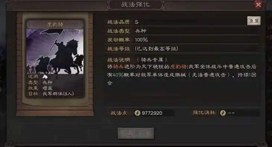 这个战法的表现比较依赖运气。如果前期能快速触发群攻并叠加武力,中后期的输出会非常可观;但如果脸黑迟迟不触发,可能会显得有点拖节奏。建议搭配虎豹骑或三势阵这类提升连击概率的兵种和阵法,让触发更稳定。由于是弓兵专属,组建队伍时一定要确保主将和副将都是弓兵适性高的角色。