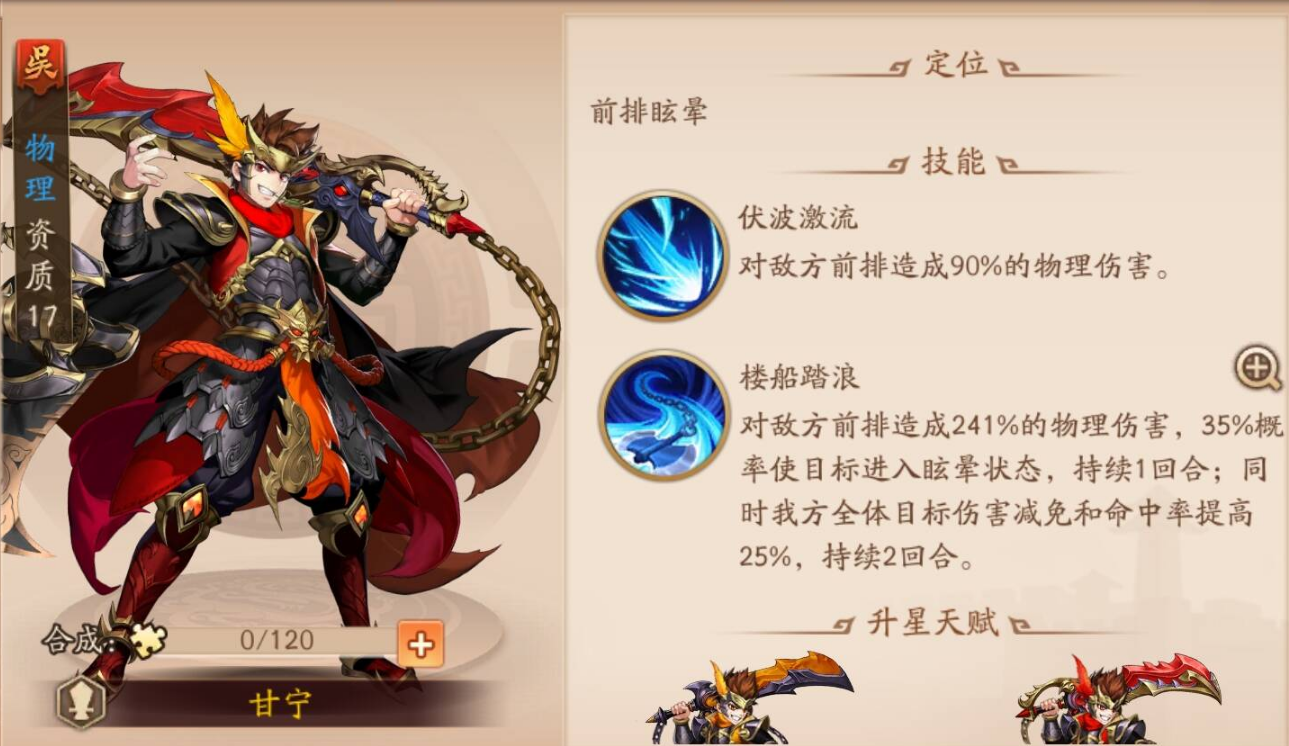 曹操的主动技能奋勇一击具备高额伤害与降低目标攻击力的双重效果,适合放置在前排承担输出与控制职责。其合击技能声东击西可对敌方全体造成伤害并概率降低防御力,配合具有群体输出能力的武将能显著提升团队爆发。天赋技能方面,建议优先选择统帅系强化生存能力,其次考虑勇武系提升输出效率,智谋系则适用于特定战术需求。