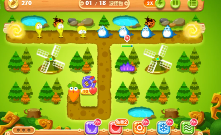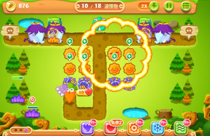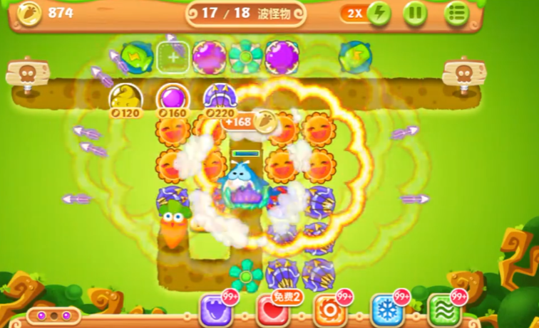开局要优先在萝卜附近放一个顶级多重箭塔,它既能打怪又能快速清理上方的大松树道具,这个道具底下藏着4个太阳花塔。注意右边也有个大松树,打掉后同样会出4个太阳花塔,这样70秒内找齐8个太阳花的任务就完成了。前期别急着把太阳花全升满级,留点机会让多重箭塔多杀怪,因为任务要求用多重箭消灭90个怪物。记得风扇塔要放在中间能覆盖双路线的地方,减速效果对双出口关卡特别重要。