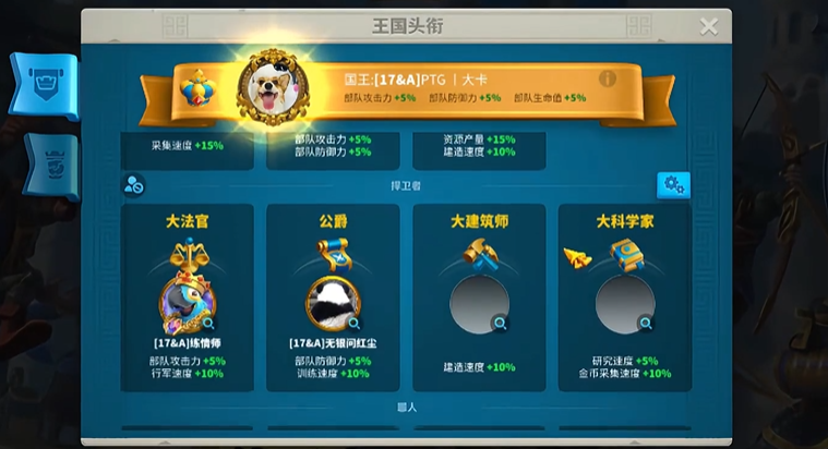 最后再给你唠几句关于头衔本身的小细节。头衔提供的加成种类非常丰富,不仅仅是加快建造那么简单。有的能提升你的部队攻击力或防御力,让你在打架时更有底气;有的能增加你的资源产量,让你发育得更舒服;还有的专门加成金币采集速度等等。 你需要根据自己当前的发展阶段来做出选择。如果你正在全力冲击某个重要的建筑等级,那么优先申请增加建造速度的头衔就是最划算的;如果你正准备参与一场大规模集结战斗,那么增加部队属性的头衔就是你的首选。多留意头衔的详细描述,把它们用在对的地方,才能把这些增益效果的价值发挥到最大。