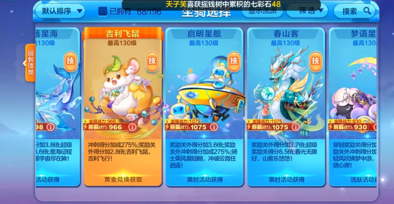 挑选钻石坐骑首先是看它的核心技能是不是贴合你的玩法。有的坐骑擅长冲刺得分加成,有的则能把普通金币或道具变成高分飞星,这就是我们常说的得分向坐骑,对于想冲高分的玩家来说,这种坐骑就是钻石投资的首选目标。 另一个关键点是看它的通用性,一个好的钻石坐骑应该能和多个你拥有的角色都配合得不错,不需要你非得凑齐某个特定角色或宝物才能发挥威力。