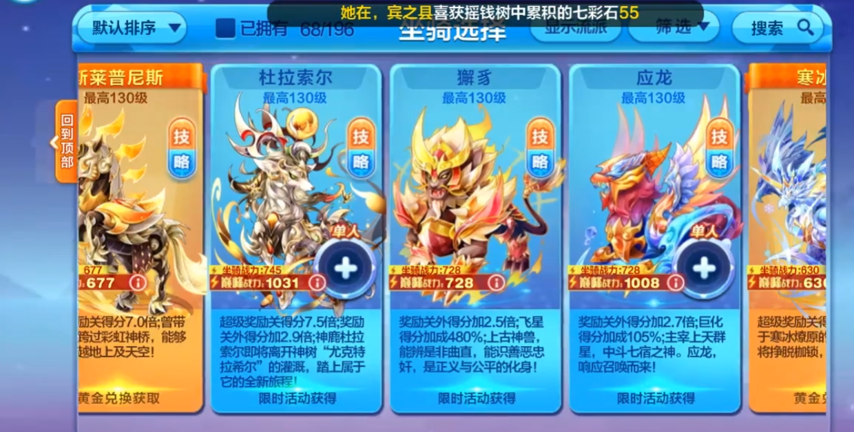 坐骑不是孤立存,它需要和你的角色、宠物甚至宝物形成一个整体。有些坐骑对特定类型的角色有额外加分,比如对男性或女性角色有得分加成。 更推荐先关注那些本身能力全面、对队友依赖度不高的坐骑。这类坐骑自己就有很强的得分能力,对宠物和宝物的要求相对宽松,即使暂时没有顶级的宠物或宝物,它也能表现出不错的效果。