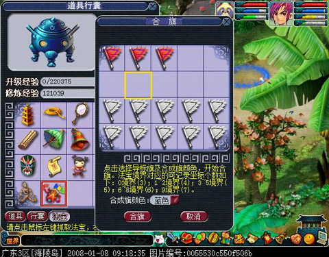 需要右键点击你的五色旗盒,然后把你想合并的、带有坐标的普通导标旗放进去。这里有个小细节要注意,用来合成的导标旗必须是同一个场景里的坐标,不能把长安城的旗子和傲来国的旗子混在一起合。放好之后,点击确定,就能生成一面崭新的合成旗了。这个合成旗的颜色还可以自己选择,看起来更个性。合成旗的使用次数,就是把原来那几个单点旗的剩余次数加起来,所以一点也不浪费。