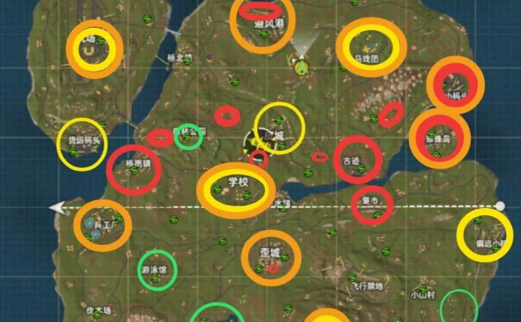 具体到地图上的点位,战斗岛的资源分布有清晰的规律可循。歪城作为地图上最大的城市之一,资源丰富,尤其是拼图楼和C字楼区域,信号枪经常刷新在建筑的角落或隐蔽房间内,需要仔细搜寻。机场的C字楼和货运中心也是经典的高概率区域,不过由于资源集中,竞争通常较为激烈。避风港虽然规模不大,但上方的一排房屋是已知的信号枪热点,偶尔会出现连续刷新多把的情况。飞行禁地本身资源不错,但信号枪更多出现在其附近的野外区域,这些地方通常人烟稀少,适合安静发育。