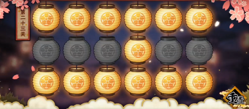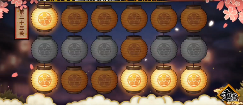 因为灯笼的布局暗藏了两个十字架结构,点击第一行第三个灯笼,它能影响左上角一片区域的状态,而点击第三行第四个灯笼,则负责搞定右下角那一片,相当于把整个灯笼阵分成了左右两个区块来分别处理,每个区块用一个关键点击就能搞定,这种设计让解谜思路变得清晰,你不用一个灯笼一个灯笼去试,只需要盯住这两个十字架的中心点,一次性就能覆盖所有目标,理解了这一点,你再回头看灯笼排列,就会觉得豁然开朗,原来设计师早把答案藏在了布局里。
