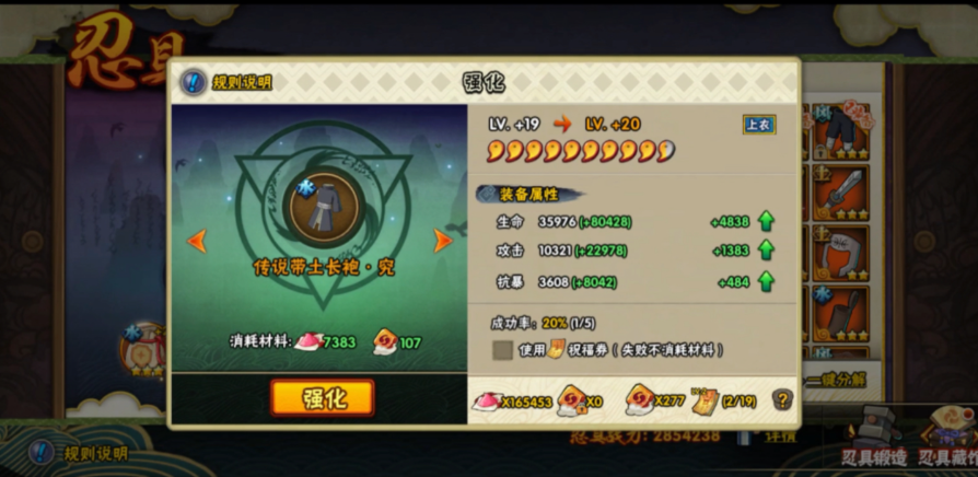 除了秘境翻牌,忍具合成是另一项获取传说忍具的方式,合成操作需在背包界面选择两个忍具进行合并,传说忍具合成需要消耗大量金币、忍术符和忍者碎片等材料,但成功率并非百分百,失败会损失材料而不会破坏原有忍具。合成时系统会根据忍具等级自动适配方式,新忍具的属性种类和数值受材料与成功率影响。普通忍具合成适合新手过渡,而传说忍具合成虽概率极低,但一旦成功便能大幅强化角色能力。