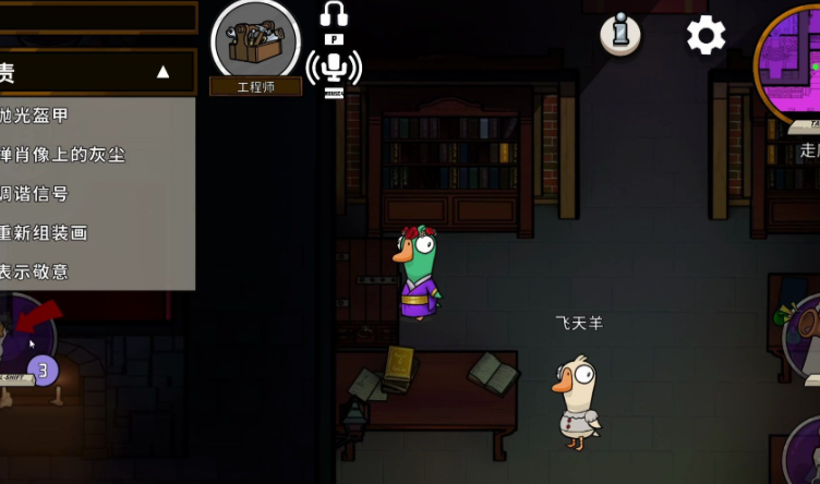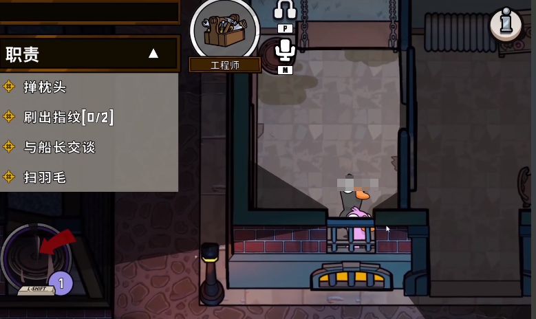 除了躲进盔甲和柜子,工程师还能暂时使用地图的管道或通风口进行移动和隐藏,这个技能有冷却时间限制。当鸭子发动破坏技能时,工程师还有一个独特优势,他能在地图上看到一个红色的范围圈,这个红圈标识了存活的、发动破坏的鸭子的大概位置,通过这个信息可以估算出鸭子的活动范围。