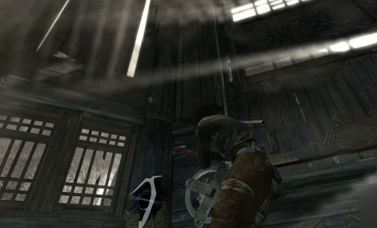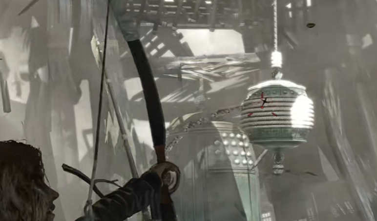 在两侧柱子都被撞坏后,你需要返回窗户机关处,将两扇窗户全部打开,使室内风力达到最大。你需要站到正对大钟前方的位置,使用绳索箭将摆锤向后拉到极限位置后释放,摆锤会在两股强风的共同作用下,以最大的力量和幅度向上摆起,猛烈撞击大钟上方的木质横梁。横梁被撞断后,失去悬挂的大钟便会重重落下,砸碎下方的地板,通关的路径由此打开。