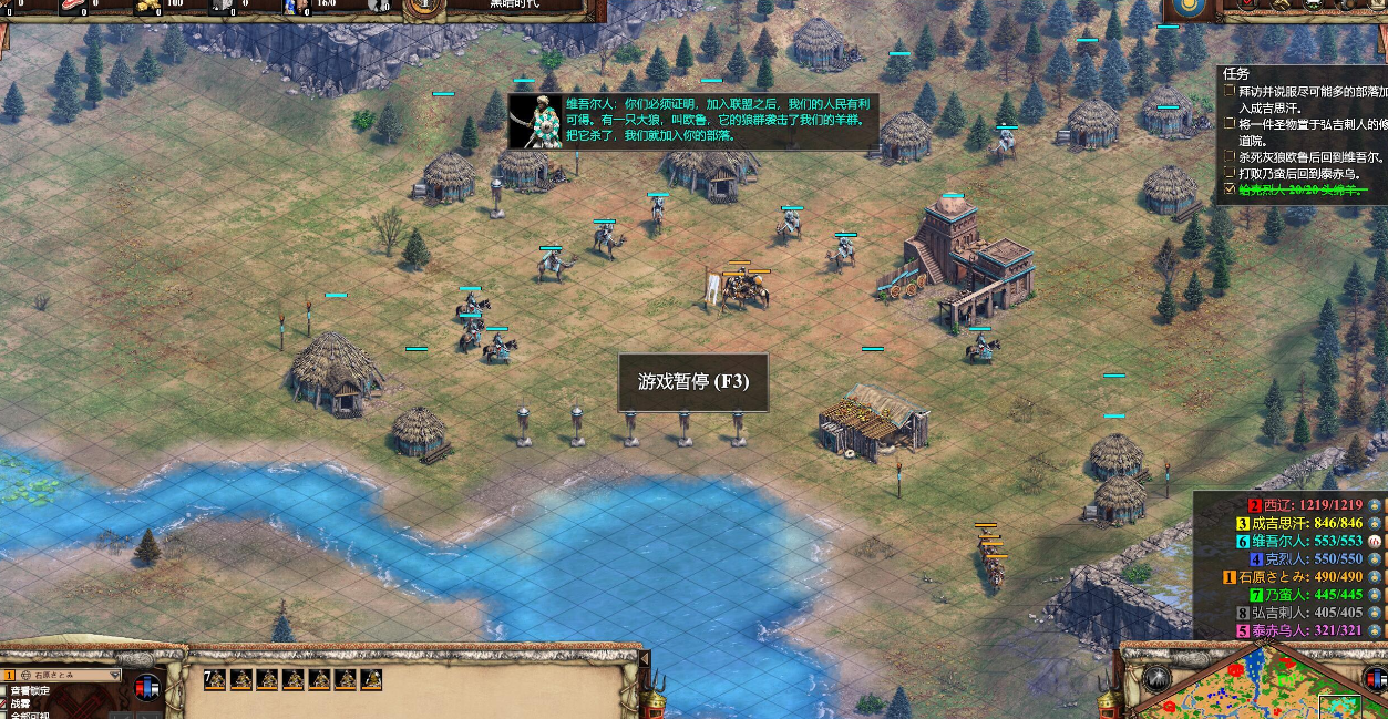 游戏开始时你拥有4个轻骑兵和4个骑射手,首要任务是找到地图上的蓝色克里伊特部落并接取他们的委托。他们会要求你收集20只羊,这是获得僧侣的关键前置步骤。羊群在地图上分布较散,按照高效的路线进行收集能节省大量时间,例如按照6只、3只、2只、3只、9只的顺序去寻找就是一个被验证过的省时方法。将所有找到的羊赶回蓝色部落附近后,他们便会带着6个骑射手和2个僧侣加入你的队伍,至此你才拥有了回收圣物所必需的单位。