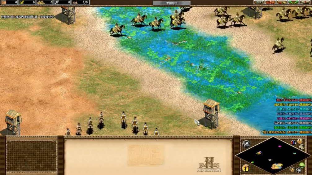 开局后,你控制着铁木真和少量骑兵单位,没有基地和经济生产环节。首要任务是利用轻骑兵探索地图,尽早发现并收集散布在地图上的绵羊、鹿群等野生动物,它们是本关食物补给的主要来源,对维持部队战斗力至关重要。在探索过程中,需注意避开红色女真人部落的防御塔和驻军,其营地戒备森严,前期不宜正面冲突。