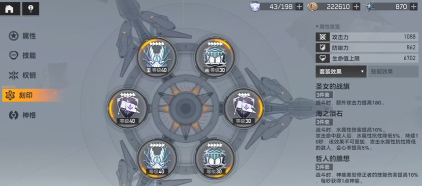 潮音的刻印搭配主要分为输出流和辅助流两种方向,玩家可根据队伍需求选择。输出流追求伤害最大化,常见搭配为海之泪石、哲人的臆想与狮鹫之傲(或不朽之船、女巫的审判),刻印位置安排需注意属性加成,例如海之泪石常放在1、3或1、5号位以获取水伤加成。辅助流则专注于强化治疗和生存,常用医者的誓言、比米尼的泉水与屠龙的歌谣进行2+2+2组合。当角色达到高阶(如欧米茄)可携带三套刻印时,可以混合搭配,例如同时配备医者的誓言(1、2号位)、海之泪石(3、5号位)和哲人的臆想(4、6号位),实现攻防一体。赋能属性的选择以会心率、攻击力为最优先,其次是会心伤害、水属性伤害和技能伤害。