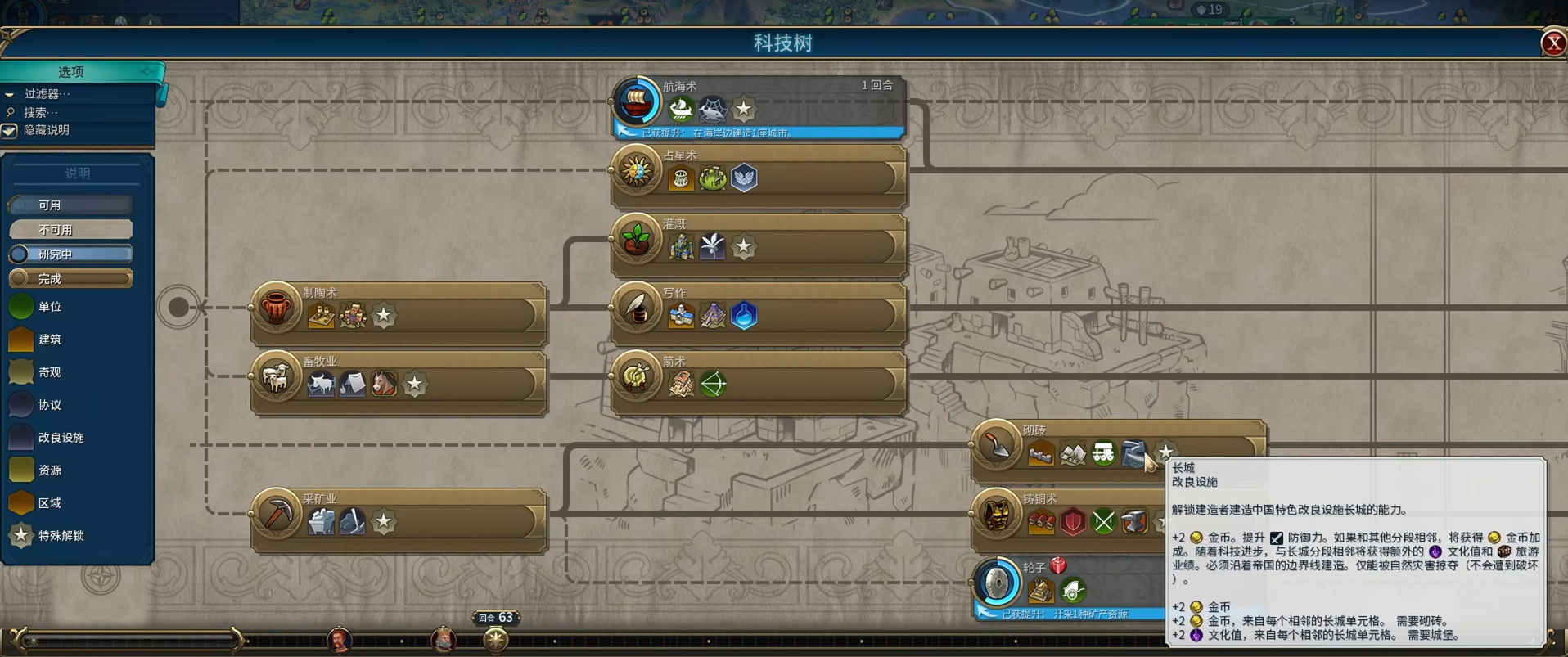 建造长城前需清理地块障碍,森林、雨林、沼泽等自然地貌单元格必须移除地貌后才可建造,资源单元格需改良或移除资源,泛滥平原无论何种类型均无法放置,城区、奇观与其他改良设施占据的单元格也不可重叠建造。解锁砌砖科技后建造者即可修建长城,每段长城提供基础金币产出,相邻分段会触发联动加成,解锁城堡科技后,相邻长城可额外提升文化值产出,后期解锁飞行科技后,文化产出会转化为旅游业绩,助力文化胜利。