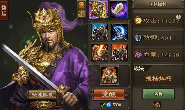 魏延属于紫色品质的攻城将,统率值高达85,擅长肉搏战斗。觉醒后其基础属性如攻击、防御和生命值均得到显著提升,尤其在面对城门或据点守卫时,持续伤害与破甲的组合能快速瓦解敌方防线。他的觉醒条件相对简单,仅需玩家等级达到120级并完成121级副本,无需依赖其他武将的前置觉醒,这使得他在中期即可投入实战。