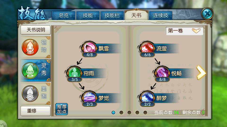 技能加点的具体分配上,第一重推荐将引蝶入梦和坐忘点满,前者提供免控反手能力,后者增加基础命中属性。第二重的花絮飞扬作为主要输出手段必须加满,同时血暖香繁的群体治疗与竹引清风的减伤效果对团队续航至关重要。第三重以画真入境为核心,配合犬神谛听的高爆发技能,能在副本中快速处理关键目标。天书加点需优先激活悦畅和玄默,前者每级提供181点暴击,后者每级增加3755点气血上限,22级累计可提升82610点气血。