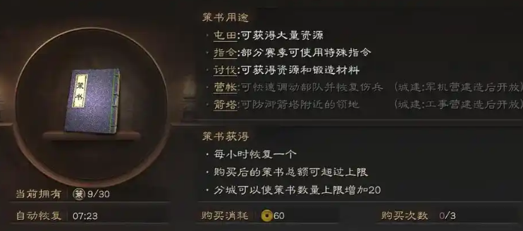 策书是三国志战略版中重要的战略资源,主要用于屯田、筑城、讨伐、营帐和箭塔等功能。合理利用策书可以加速资源获取、提升城建效率并增强战场优势。策书每小时自然恢复1个,无分城时上限为30个,有分城时上限提升至50个。每日可通过金珠购买3次,每次获得3个策书,因此理论上每日最多可获取33个策书。