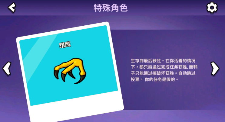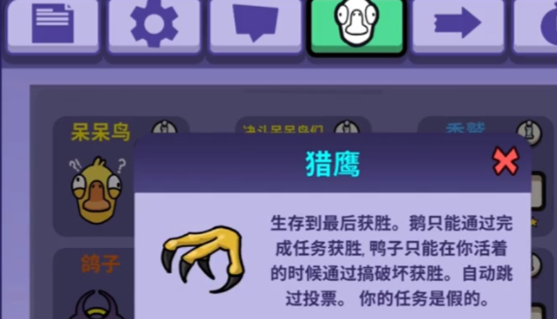 猎鹰是鹅鸭杀中一个非常有趣的中立角色,咱们的获胜条件很简单,就是活到最后。这个角色不能投票,只能跳过,所以咱们得靠刀人和策略来取胜。猎鹰的技能会直接影响其他阵营的玩法,比如鸭子只能在咱们活着时通过搞破坏获胜,而鹅必须完成任务才能赢。咱们的任务是假的,不用管,专心观察场上局势就行。