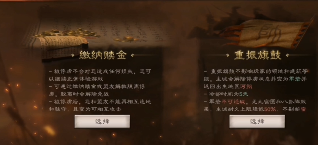重振旗鼓是解除俘虏状态的特殊功能,主要适用于天下争锋剧本。当玩家被俘虏时,可在政厅界面选择重振旗鼓,系统会将主城变为军砦并随机迁移至出生州地块。该操作无需占领11块地即可完成迁城,但会导致城池耐久减半且暂时失去九宫图、八卦阵效果,同时周边不会刷新木牛流马等资源。重建主城需消耗各资源10万,72小时冷却期内只能在军砦所在州操作。