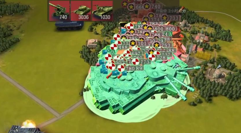 中期发展要抓住两个转折点:LV.11出装甲侦察车替换摩托化步兵,LV.13解锁攻城炮后立刻组建800榴弹炮部队刷军费。这时候别心疼资源,把所有属地升到3级,高产农场和橡胶厂必须优先冲4级。重型坦克和自行火炮成型后,立刻集结1600重坦+2000攻城炮的部队,按重坦扛伤-歼击车切后排-攻城炮拆塔的节奏推15级叛军城,拿下高级资源区就能滚雪球发展。