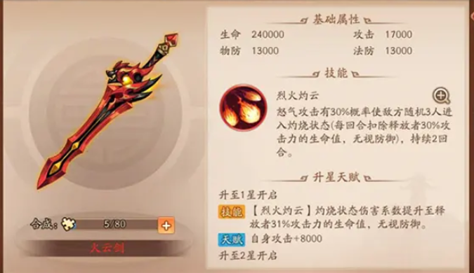 吕蒙的定位是残阵收割和团队免疫增益,所以神兵选择要围绕这个特点展开。除了上述两种攻击型神兵,也可以考虑火云剑来增强灼烧效果,毕竟吴国阵容很多武将都有灼烧技能。吕蒙本身暴击率不高,像雌雄双剑这种依赖暴击的神兵就不太适合他。