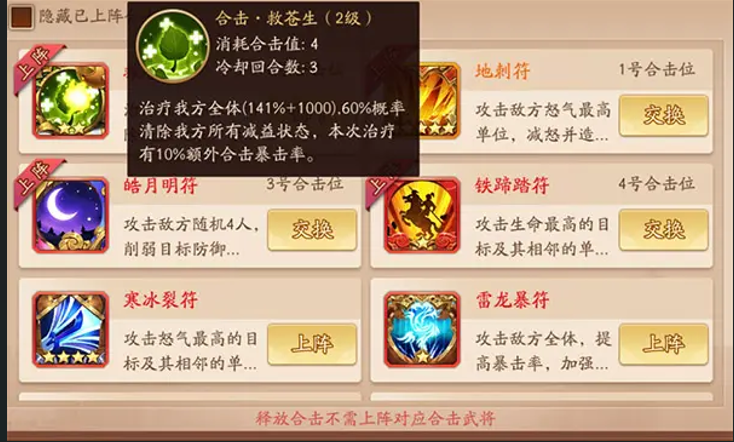 红色合击中,寒冰裂符是魏国专属技能,需夏侯惇与夏侯渊激活,十字攻击范围覆盖四名敌人,附带晕眩概率和减伤效果,完美契合魏国控制流打法。枪剑合符作为免费获取的红色技能,可提升前排输出或格挡率,灵活适配不同战局。救苍生符则是团队生存保障,由华佗与鲁肃激活,提供群体治疗和异常状态驱散,尤其在对抗持续伤害型阵容时效果显著。高阶玩家需优先将寒冰裂符升至满星以最大化控制收益。