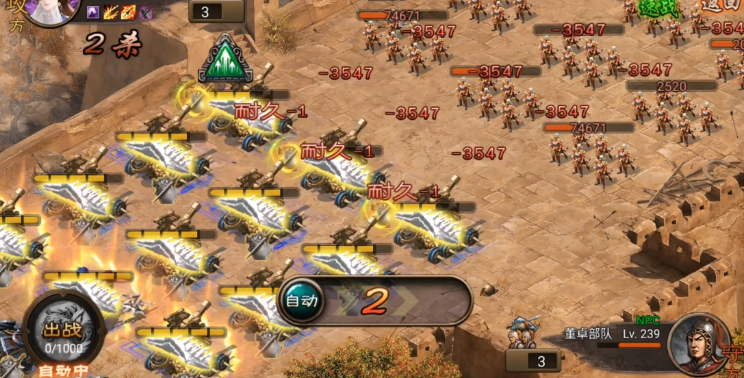 夏侯渊可以带副将诸葛亮,起手吃第一NPC的战法,剩下4排残血加1排满血,然后平砍到最后一排再放战法,为后面的黄月英创造优势。黄月英带副将张辽,借助夏侯渊的buff一路平砍,最后一排放战法,正常情况下能打掉3个NPC,还能把第4个NPC的战车打掉并重创前4排。孙权或关羽可以在这里收残兵,用关羽的话要注意放战法的时机。司马懿带副将曹仁,正常情况下第4个NPC只剩1排兵,直接撞就行,最后见到主将董卓反掉战法就完成任务。