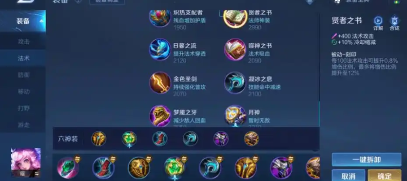 除了上面说的半肉辅助流,还有一种偏向法强的出装思路,但这种玩法对你的意识和走位要求更高,因为你会更脆。这种思路一般是出疾步之靴来快速支援,然后出凝冰之息、痛苦面具、博学者之怒和贤者之书这些法强装备。这样出装的瑶,一、二技能的伤害会可观一些,但核心的大招护盾值其实主要看生命值加成,法强的收益是次要的。