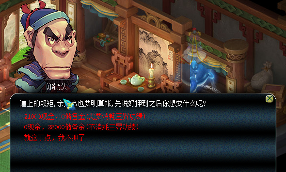 跑镖过程中还有些小细节和特殊情况需要注意,掌握它们能让你的体验更顺心。有时候在郑镖头那里领任务,他会突然让你认一个成语,题目可能有点生僻,但仔细看看他给出的例句,答案往往就藏在里面。如果你不幸在护送途中打输了或者逃跑了,身上的镖银就会被抢走,这时候你只能回去找郑镖头取消任务,代价是会被扣除一部分违约金和少许人气值,而且接下来几分钟内不能再领任务。如果你接到一个目的地特别遥远、实在不想跑的任务,其实有个不是办法的办法,那就是你可以选择把镖银卖给长安城的当铺老板,这么做的后果同样是被扣钱和扣人气,但有时候对于追求极致效率或者只想刷特定任务成就的玩家来说,也算是个可以接受的选项。