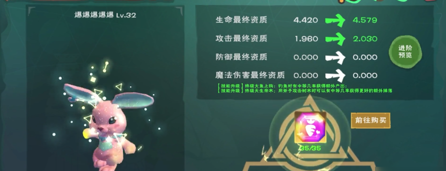 疯疯兔的技能是跟着进阶等级一步步开放的,不是一出来就啥都有,它总共有六个进阶阶段,每升一阶都需要消耗对应的进化石或者碎片,而且技能效果会越来越强。刚合成出来的疯疯兔是最基础的一阶状态,这时候它可能还没有钓鱼技能,或者只有最初始的版本,你得耐心培养它才能变厉害。
