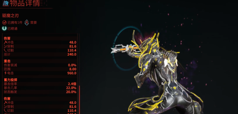 掌握驱魔之刃的核心用法关键在于理解其独特的攻击机制。这把武器主要造成切割伤害,拥有较高的基础暴击率与暴击倍率,但其常规近战攻击速度较慢。它的精髓在于投掷攻击:将武器投掷出去后,飞刃会在敌人之间自动弹射并强制触发冲击异常。更重要的技巧是手动引爆,你需要将武器切换至双持状态,进行蓄力后投掷出去,在飞刃飞行过程中按下近战攻击键(通常默认是E键)即可将其引爆,造成大范围的爆炸伤害。蓄力投掷可以显著提升这次爆炸的伤害值与暴击属性,并对爆炸范围内的所有敌人产生击倒效果。需驱魔之刃拥有无限的连击时间,其连击数可以一直累积而不会自动下降,但需避免通过振幅晶体将连击持续时间降至零,否则会导致无法获取连击数。